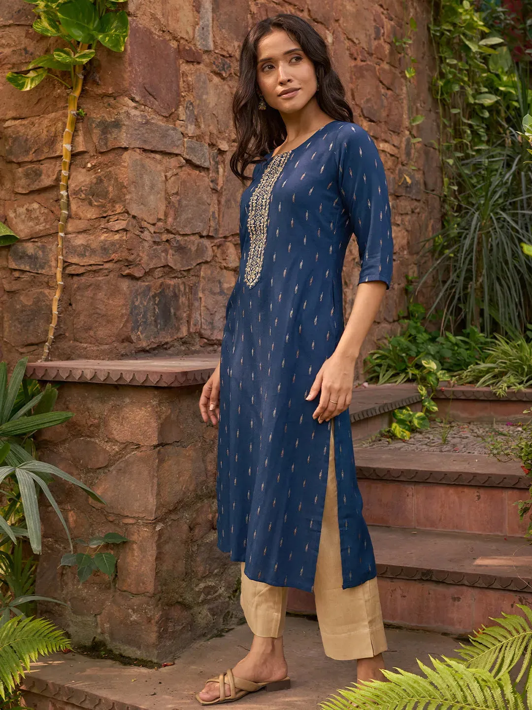 Blue Woven Design Cotton Straight Kurta