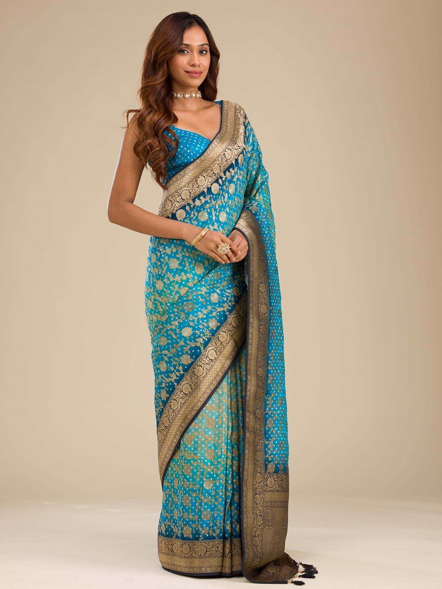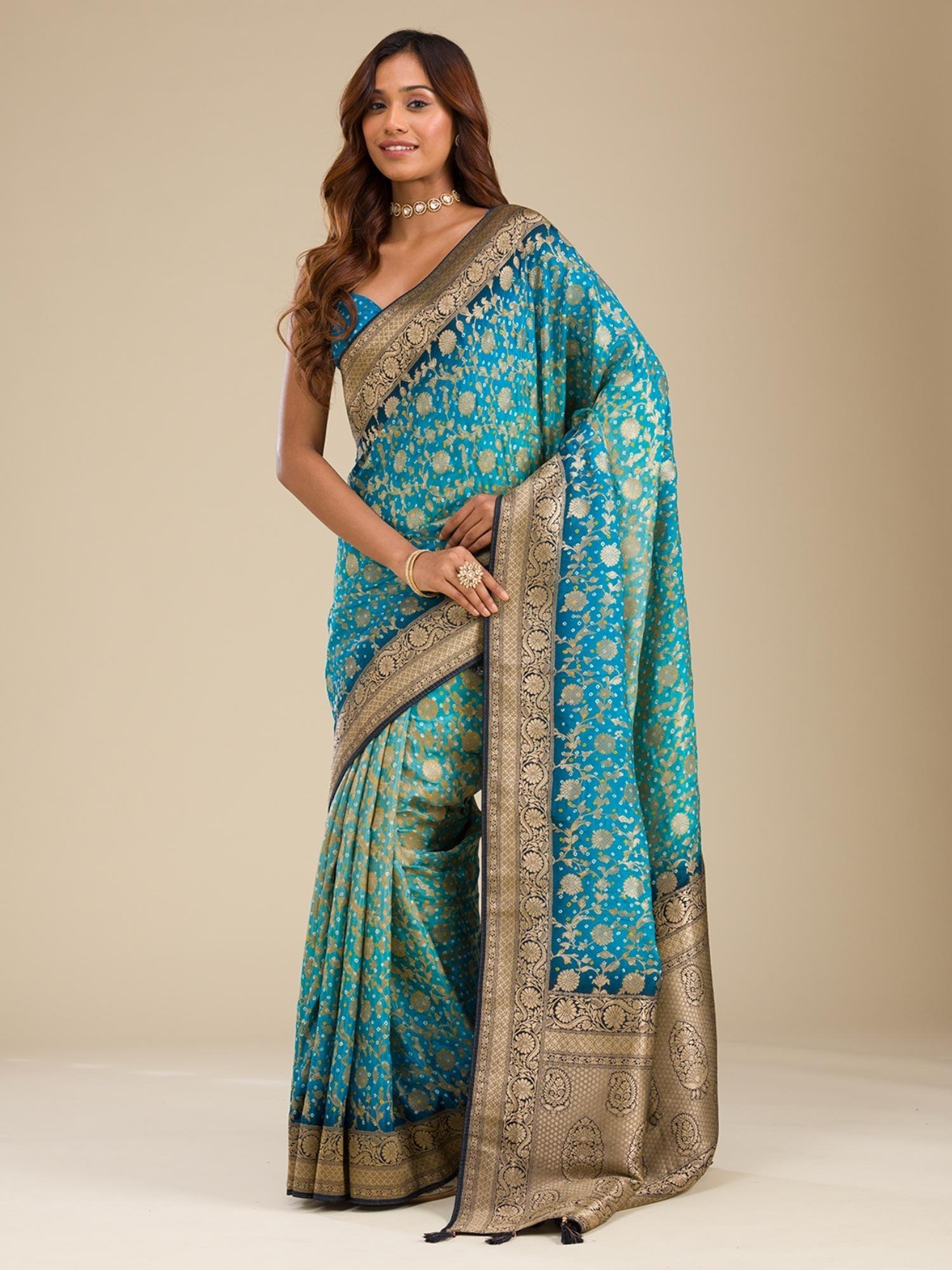 Turquoise Blue Zari Georgette Saree with Unstitched Blouse